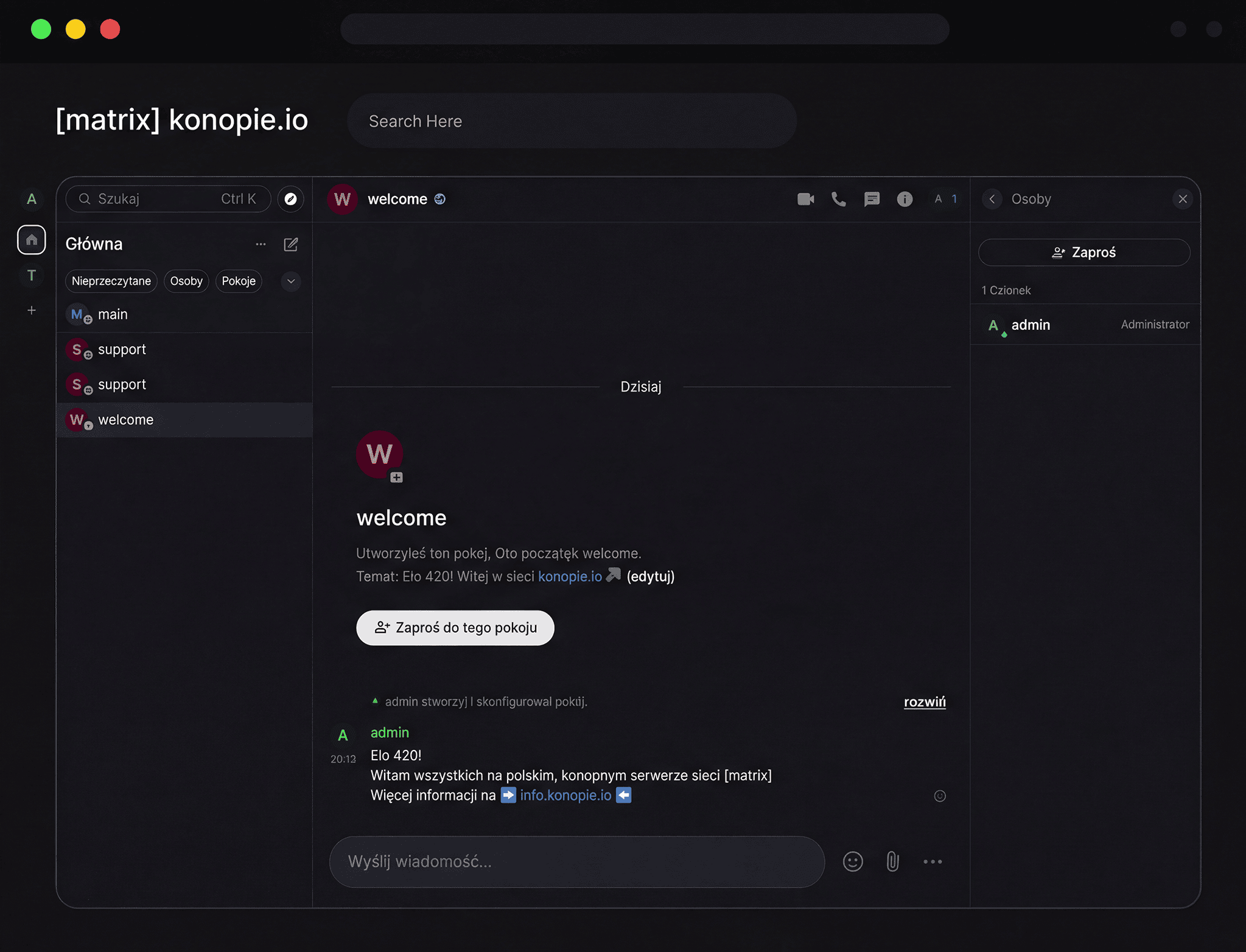 Wybierz i zainstaluj aplikację kliencką (np. Element, Cinny, FluffyChat) lub skorzystaj z wersji przeglądarkowej. Następnie załóż w niej konto na wybranym serwerze domowym (homeserver) – możesz skorzystać z domyślnego serwera sugerowanego przez aplikację, ale sugerujemy wpisać nasz polski serwer: konopie.io